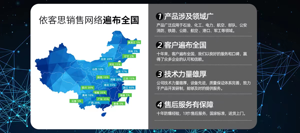 依客思防爆專注于防爆產(chǎn)品的研發(fā)、生產(chǎn)與銷售,主要產(chǎn)品有:防爆操作柱、BXCQ防爆靜電釋放儀、BZC系列防爆操作柱、不銹鋼現(xiàn)場操作箱、BXM(D)防爆照明(動(dòng)力)配電箱、BXX防爆檢修箱、BXJ防爆接線箱、LED防爆燈、防爆管件、防爆風(fēng)機(jī)等產(chǎn)品,型號(hào)規(guī)格齊全,廣泛適用于煤炭、電力、醫(yī)藥、石油、化工、航空等領(lǐng)域。我公司產(chǎn)品質(zhì)量過硬,價(jià)格實(shí)惠,銷售范圍廣,且與各大型企業(yè)建立了良好的合作關(guān)系,同時(shí)還遠(yuǎn)銷中、東亞和北美等地區(qū),深受用戶喜愛與青睞。